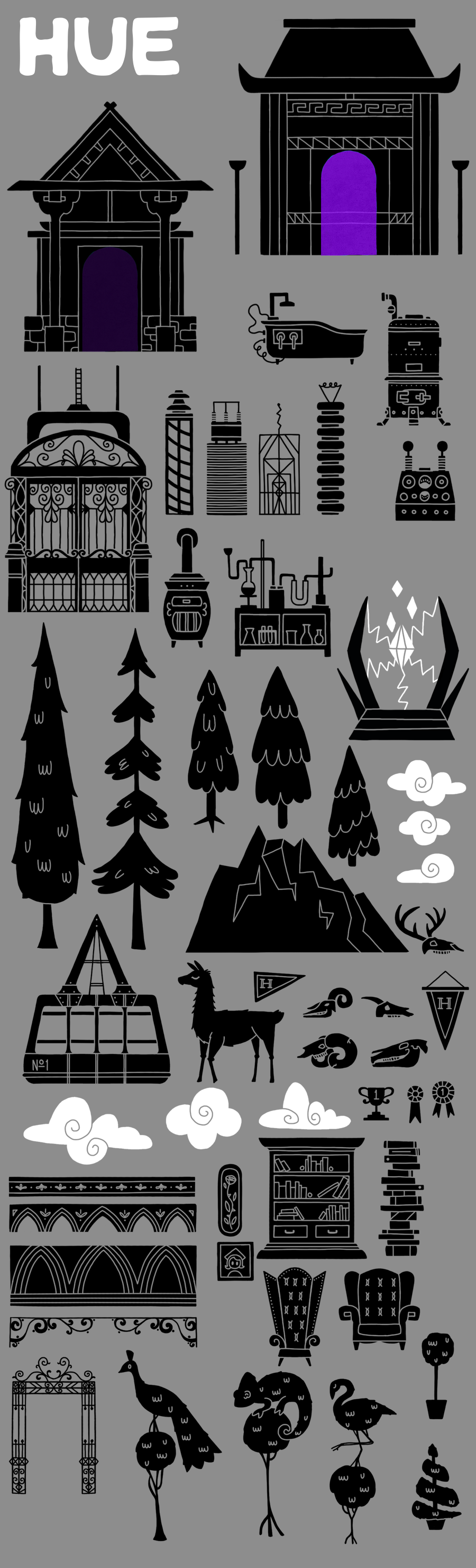 I created a large portion of in-game assets used in Hue’s gameplay and environments. Artwork for Hue was a fun challenge in that the style required only to use black and white and linework and negative space cutouts had to be a single consistent round brush size only which removed some control with asset creation but resulted in a consistent style.