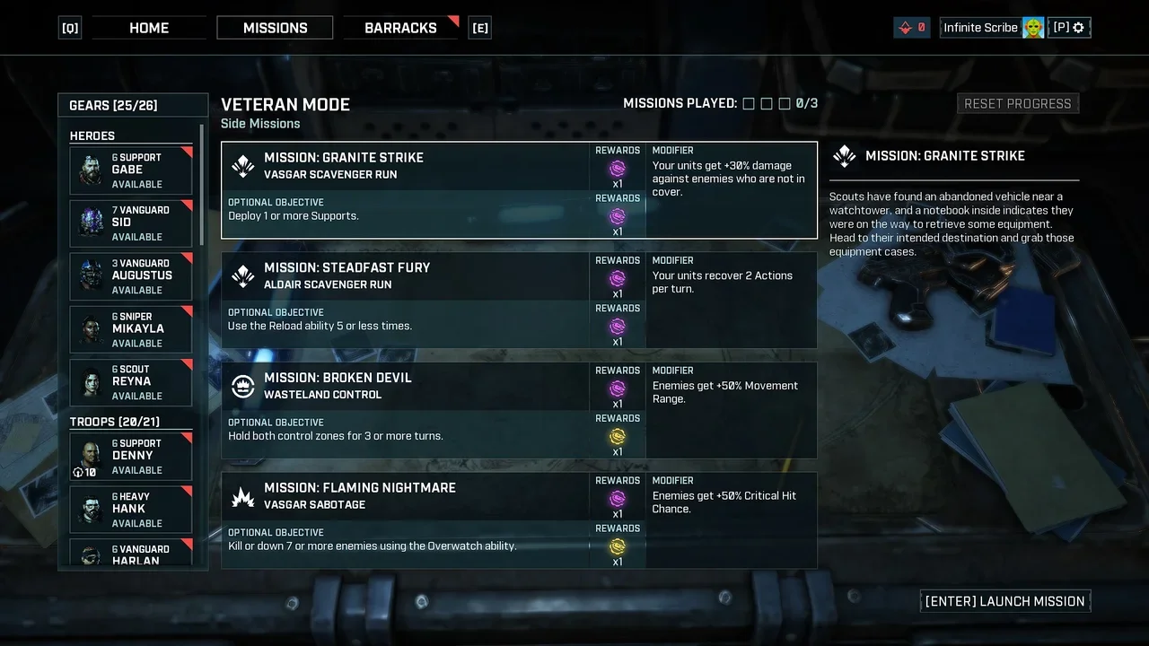 The mission screen was another area of focus, designed to clearly communicate objectives, rewards, difficulty, and squad readiness before deployment, with additional information required for veteran mode for after the player complete’s the core game missions that could allow for scalability with few or many missions available at one time.