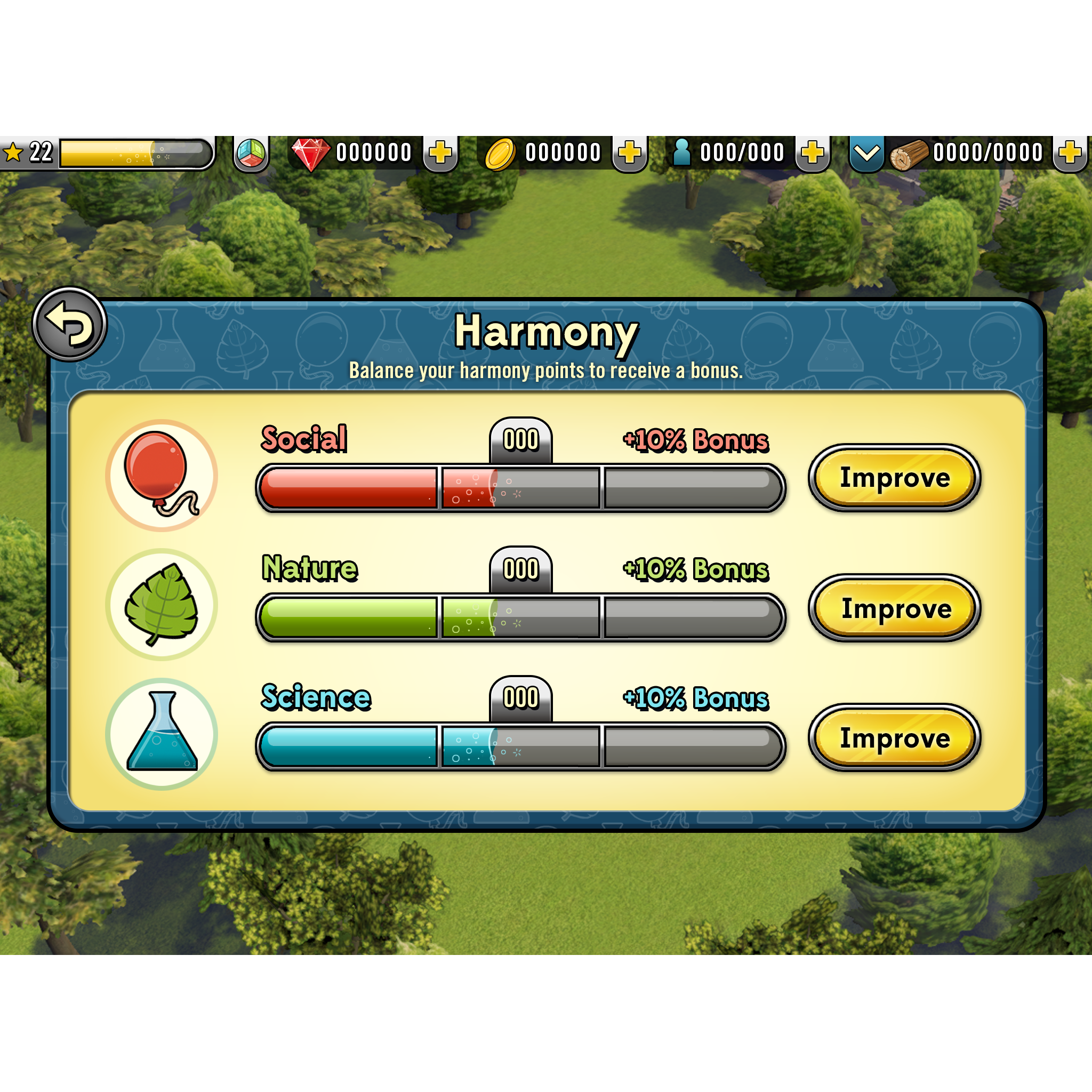 The harmony feature was a core part of the game in that players need to balance stats for the three factions in order to provide the town with ‘harmony'.