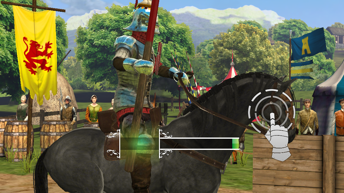 The start of a round uses a similar timed bar ‘gold swing' mechanic for launching the horse so this used the same visual language as the lance drop UI. To tutorialise elements I created a themed suit of armour hand which animated to direct attention and also used black overlays with circle cutouts for instances where the player was required to interact with a certain element to progress.