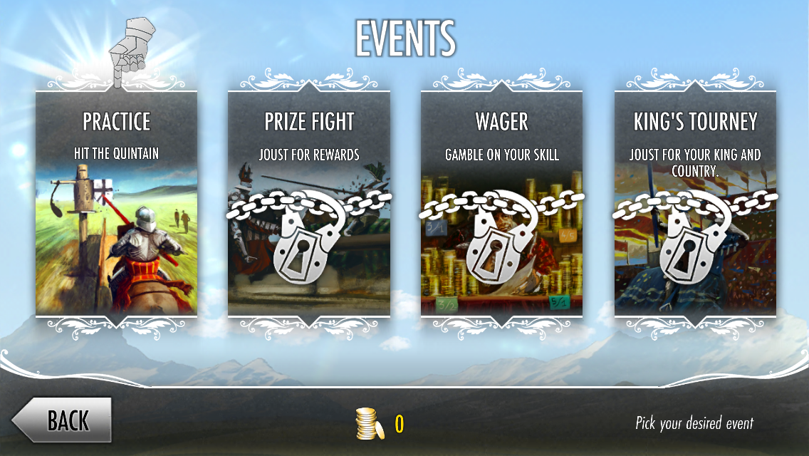 The events screen served as a game mode selection screen. The layout was intended to subtley reference house banners in shape that would be common at jousting events.