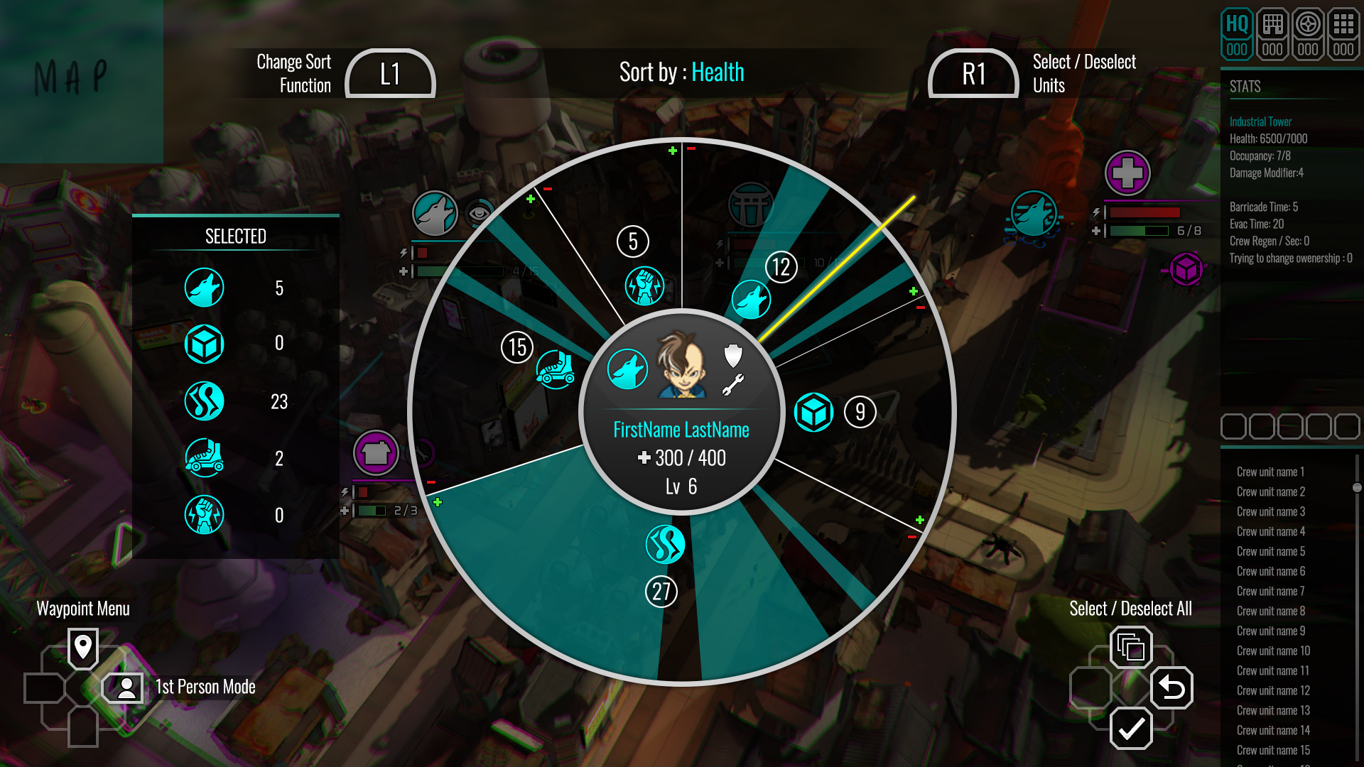 This screen was a concept for a squad selection feature. The developer had a specific interaction in mind to allow the player to make granular selections from a large amount of characters available to choose from. A selection wheel could allow players to make both broad selections quickly to grab character class types indiscriminately but also let you inspect each character to make specific choices as the player wished. The blue section represented selected squad members from each faction.