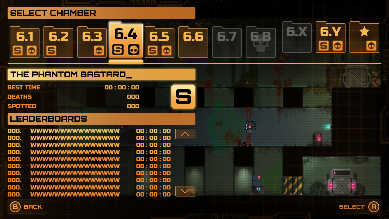 The chamber (level) select menu again emulates a intranet theming such as filing visual language. The main goal with the menu’s layout was to balance both information about the player's progress vs global scoring whilst also displaying a sneak peek of the level as a means to identify each level without giving away too much other information.
