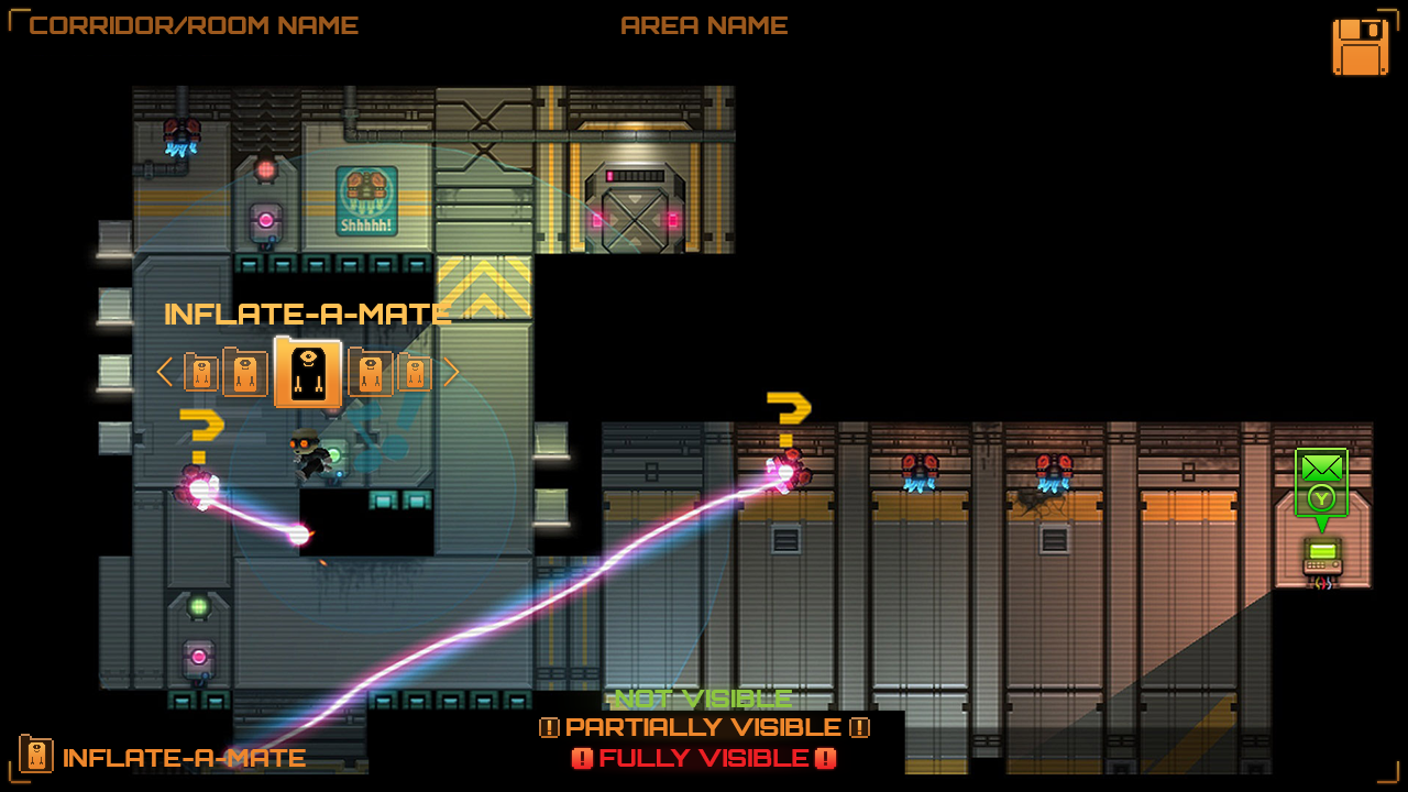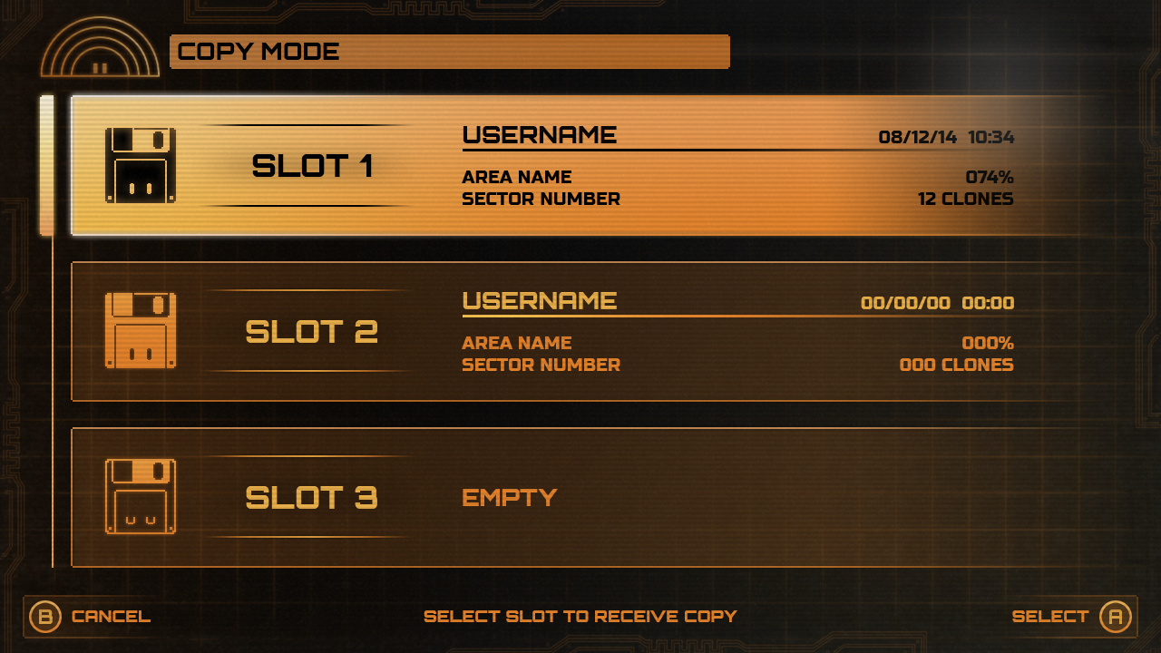 For the save game screen I emulated a retro save slot system again with a nod to a more retro tech vibe with floppy disks for the save motif. A theme in Stealth Inc 2 is that a lot of inanimate objects are anthropomorphised with little robot faces so I continued that theming here with the floppy disks with the detailing of empty slots being asleep.