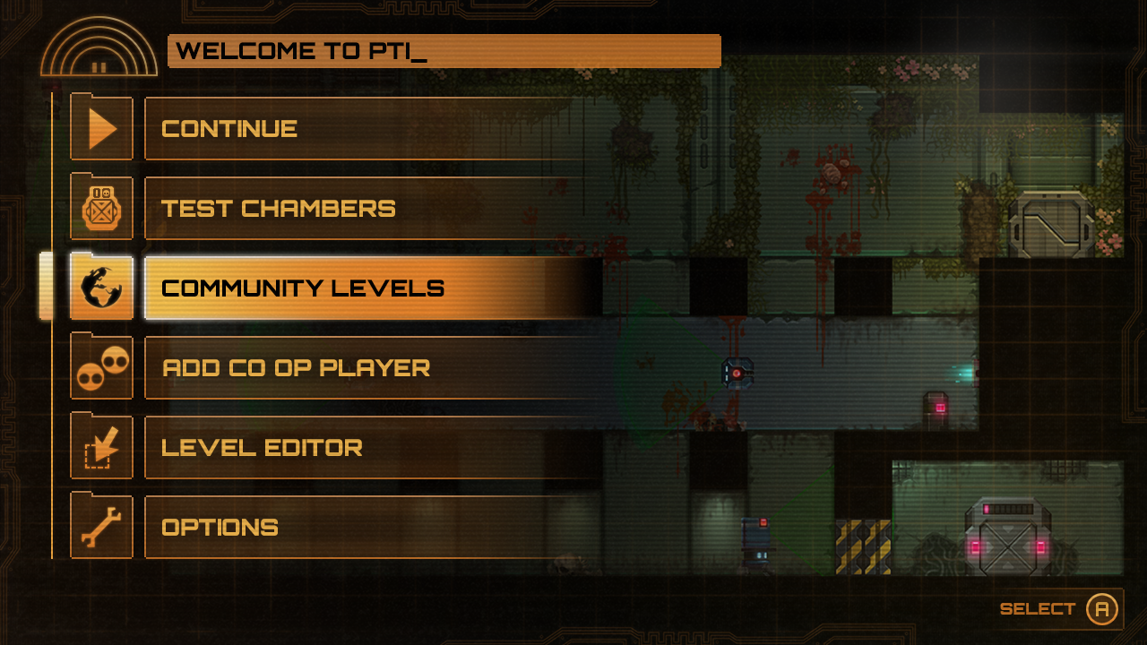 The main menu, as with the rest of the UI, as described above took inspiration from Stealth Bastard in both layout and theming, using scanlines to emulate a surveilance camera but with an elevated solid colour pixel style with other elements to convey a retro CRT ‘green screen' style corporate company intranet system.