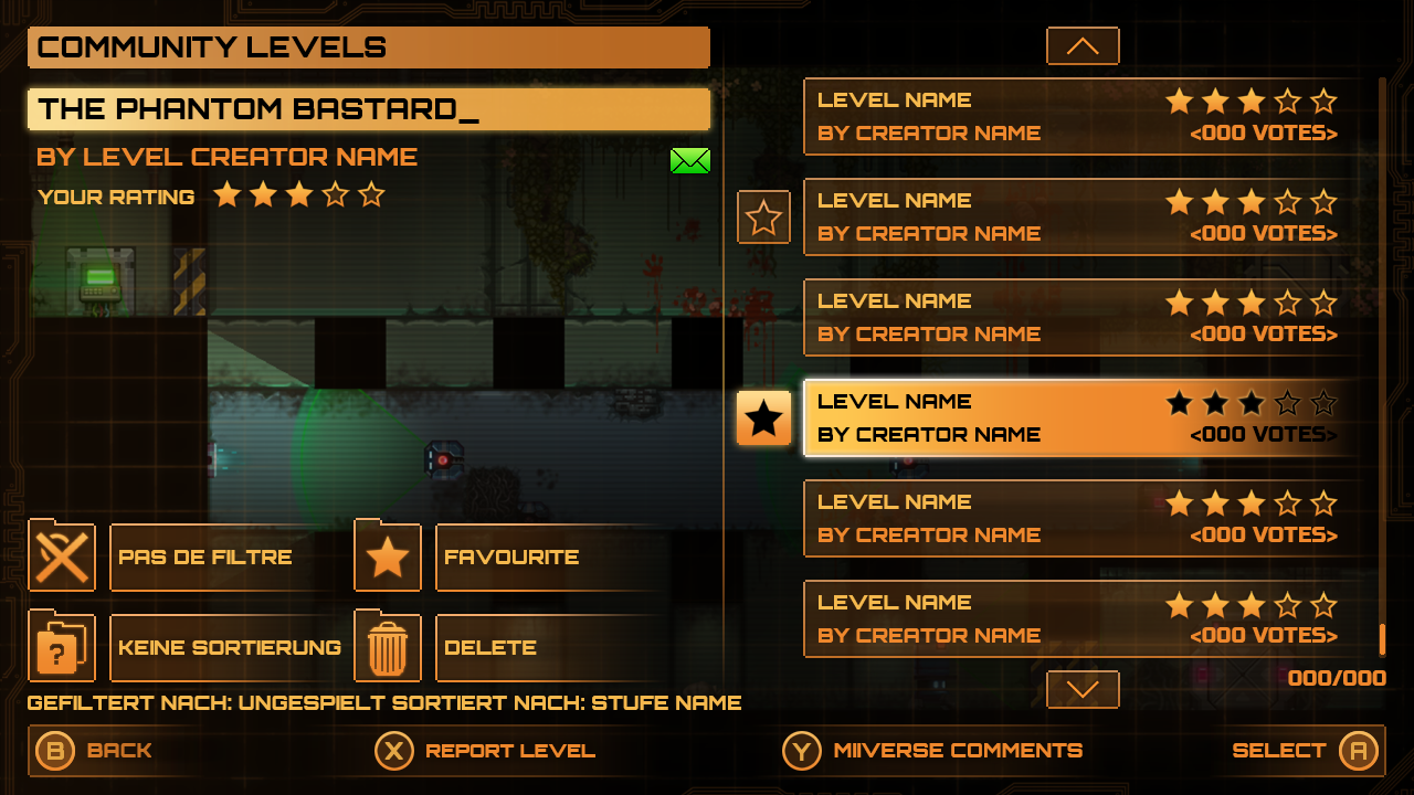 Levels created with the level editor could be uploaded to the community levels feature that could be played and rated by other players. As with the chamber select screen, the layout leaves space for a preview of the level then displays only the most critical information for each level as well as some controls for the player to filter, favourite and hide levels locally only.