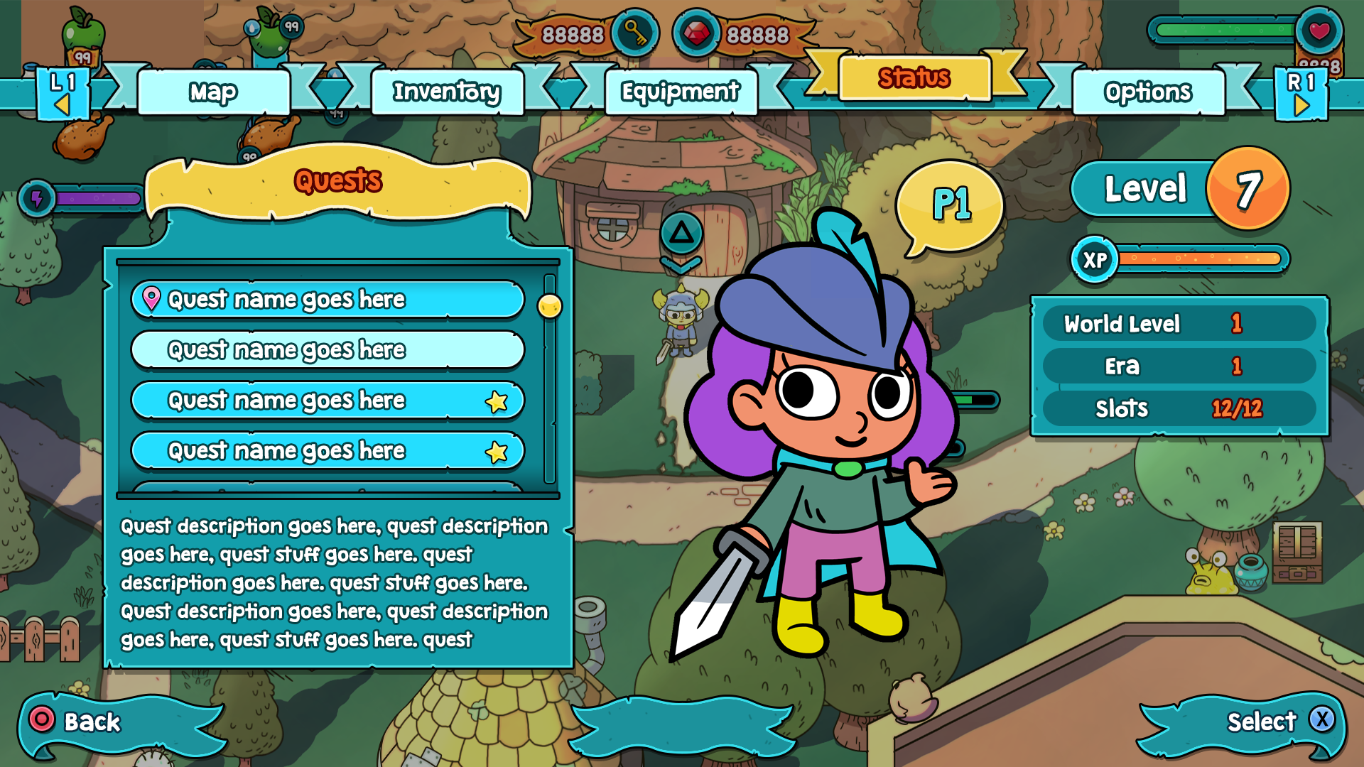 The status screen served as a snapshot of the player's progression, showing stats about their level and playthrough data as well as information about currently available quests.